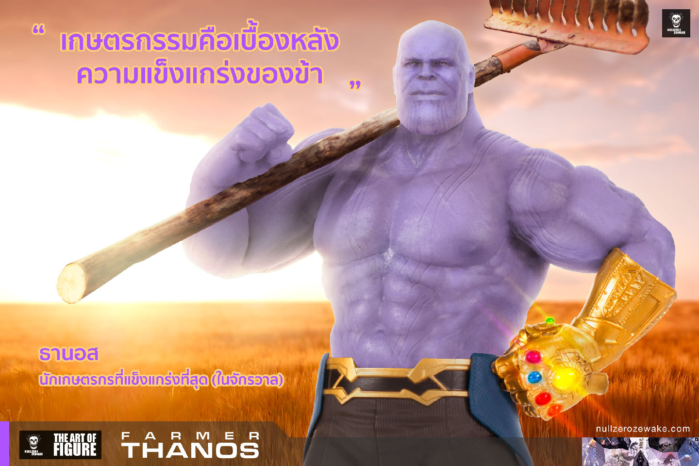 หลังจากที่ผมได้นำเสนอชุดเกราะลับของลุงธานอสกันไปแล้ว ก็มีข้อความจากลุงธานอสมาหาผม เขียนว่า “มึงมาไร่ดูสิ” ผมจึงเข้าไปคุยกับลุงธานอสที่ไร่ของแก วันนี้ลุงธานอสมาในลุคของชาวนา (Farmer Thanos) กายท่อนบนสีม่วงของแกเปลือยเปล่า มีกล้ามเป็นมัดๆ และแบกคราดพาดบ่าเดินมา ผมถามแกถึงเคล็ดลับความแข็งแกร่ง ลุงธานอสตอบผมสั้นๆว่า “เกษตรกรรมคือเบื้องหลังความแข็งแกร่งของข้า” พร้อมแอคท่าให้ผมได้จับภาพความแข็งแกร่งของแก ซึ่งผมกำลังจะนำเสนอด้านล่าง